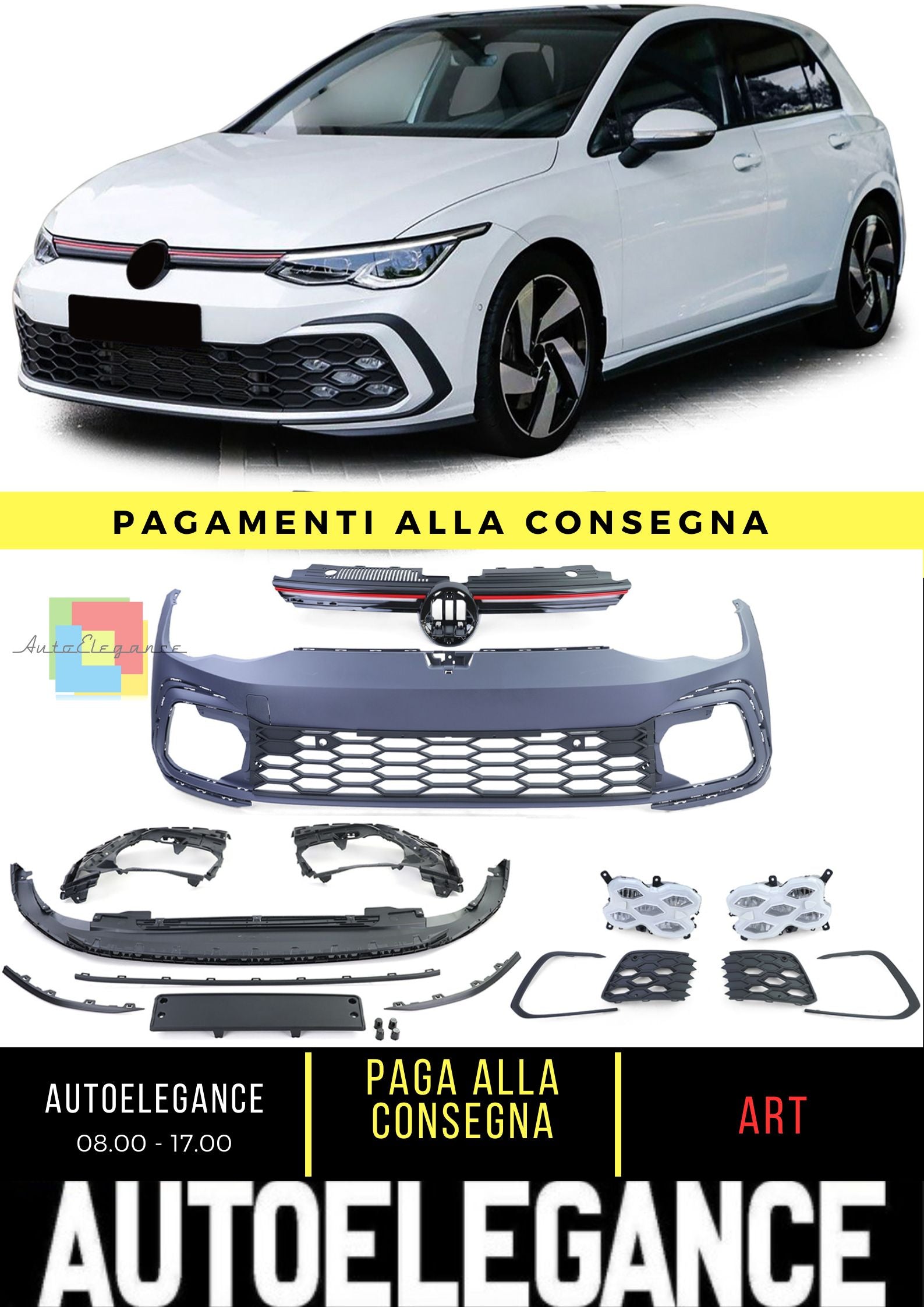 Paraurti Anteriore Sport con Calandra e LED Fendinebbia per VW Golf 8 anche GTI dal 19